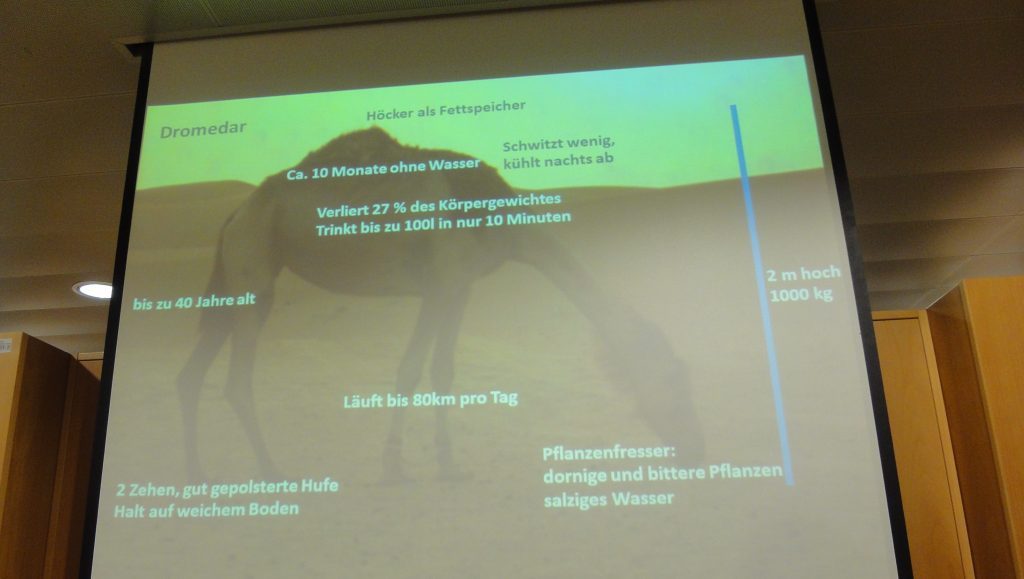 Schon im vorigen Advent hatten drei Klassen über die beliebte Caritasaktion „Schenken mit Sinn“ drei Esel für Frauen in Äthiopien gekauft. Heuer steckte sich Prof. Reinhilde Spiekermann ein größeres Ziel: Die Schule kauft ein Kamel für 370 Euro! Zwei junge engagierte Caritasreferentinnen informierten am 2. Dezember sechs Klassen mit einer PowerPoint Präsentation in der Bibliothek, dass es in Kenia aufgrund des Klimawandels inzwischen alle 2-3 Jahre Dürrekatastrophen gibt. So müssen Nomadenfamilien mühsam zu den letzten Wasserstellen ziehen. Dazu brauchen sie dringend Kamele, die wahre Wundertiere sind: Sie helfen als Lasttiere beim Wandern, können monatelang ohne Wasser überleben, sind genügsam beim Essen (auch bittere und dornige Kräuter), trinken sogar salziges Wasser, geben Milch und auch Haare und Fell werden verwendet. Außerdem leben Kamele bis zu 40 Jahre lang. Schnell waren die SchülerInnen motiviert für ein Kamel zu spenden. In der Aula stehen auf einem großen gebastelten Holzkamel die Informationen. In eine Spendenbox kann jederzeit Geld eingeworfen werden, weil die Box den ganzen Tag bei Susis Buffet steht. Herzliches Danke an Susi, die uns beim Sammeln tatkräftig unterstützt! Als Hit entpuppt sich die anschauliche Spendenlatte: Auf einem Brett gibt es einen „Wüstenweg“ mit Sand wo ein kleines Kamel aus Holz der Spendenlatte entlang zum Ziel – nämlich 370 Euro – geschoben wird. In der großen Pause werden das große Holzkamel und der Wüstenweg in die Mitte der Aula gerückt und die Vorbeigehenden zum Spenden motiviert. Jede/r, ob groß oder klein, möchte das Kamel weiterschieben: „Wie weit ist unser Kamel schon?“ interessieren sich fast alle SchülerInnen und viele wollen das kleine Kamel weitergerückt sehen.
