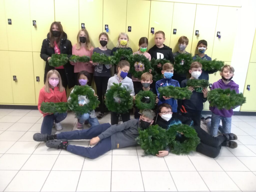Endlich konnte eine alte Tradition und somit etwas Normalität in unserem Schulgebäude wieder gelebt werden. Die Tradition des Adventkranzbindens wurde von Kollegin Reinhilde Spikermann, die sich mittlerweile in Pension befindet, eingeführt und über viele Jahre jeden Donnerstag vor dem 1. Adventsonntag in der Schule mit Schüler*innen durchgeführt. Dabei wurden die jüngeren Schüler*innen in die Kunst des Kranzbindens von älteren eingeführt. Der Duft der Tannennadeln und das fleißige Arbeiten förderte nicht nur die Gemeinschaft, sondern verströmte im gesamten Schulgebäude die Vorahnung auf die Weihnachtszeit.