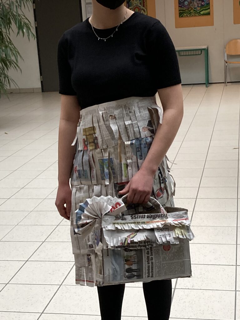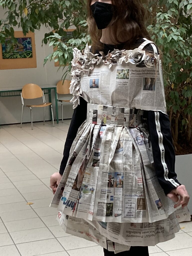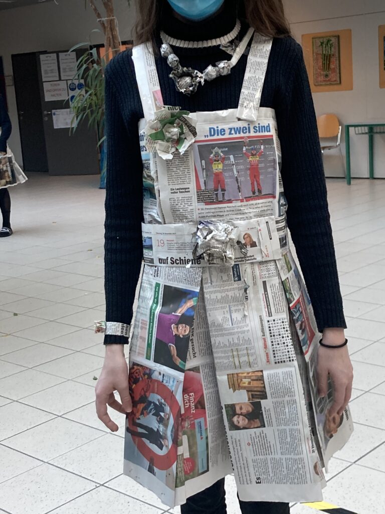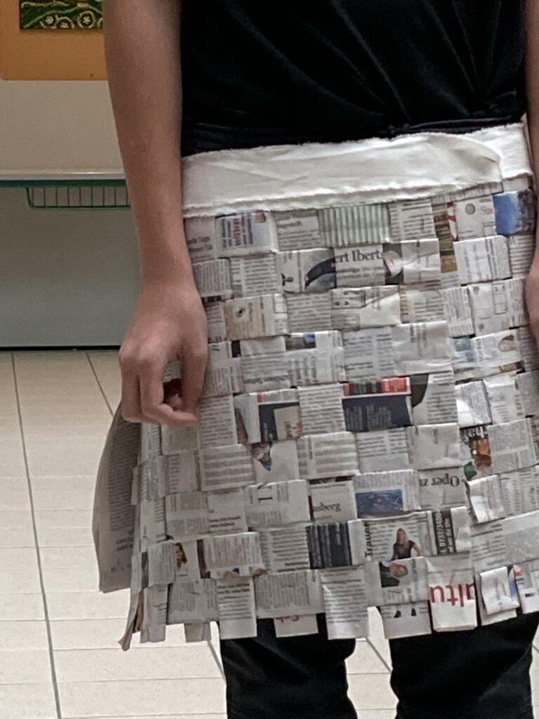 Die Schüler*innen der 4. Klassen, die den gymnasialen Zweig besuchen, stellten im Sprachenatelier ihre Kreativität unter Beweis und fertigten originelle Outfits aus Zeitungspapier an. So entstanden aus alten Zeitungen ein Schottenrock mit Stirnband, ein Faltenrock mit einer eleganten Handtasche und zwei hübsche Kleider mit kreativen Details. Dabei wurde gewebt, gefaltet, geklebt, geschnitten sowie Blumen und andere Accessoires gebastelt. Die Schüler*innen konnten ihrer Kreativität freien Lauf lassen und hatten viel Spaß beim Anfertigen und Anprobieren ihrer Kleidung. Anschließend durften sie ihre selbst designten Kleidungsstücke in einer „Modenschau“ vorführen. Die anderen Gruppenmitglieder präsentierten ihr Model auf Französisch und kommentierten die Kleidungsstücke. Die folgenden Fotos zeigen die originellen Kleidungsstücke der 4. Klassen.