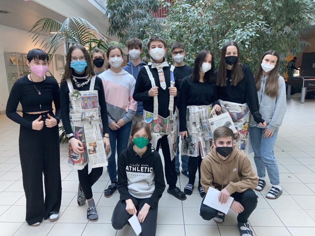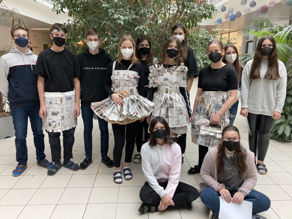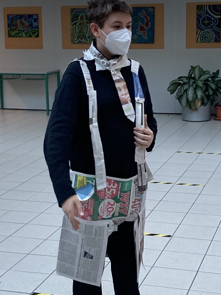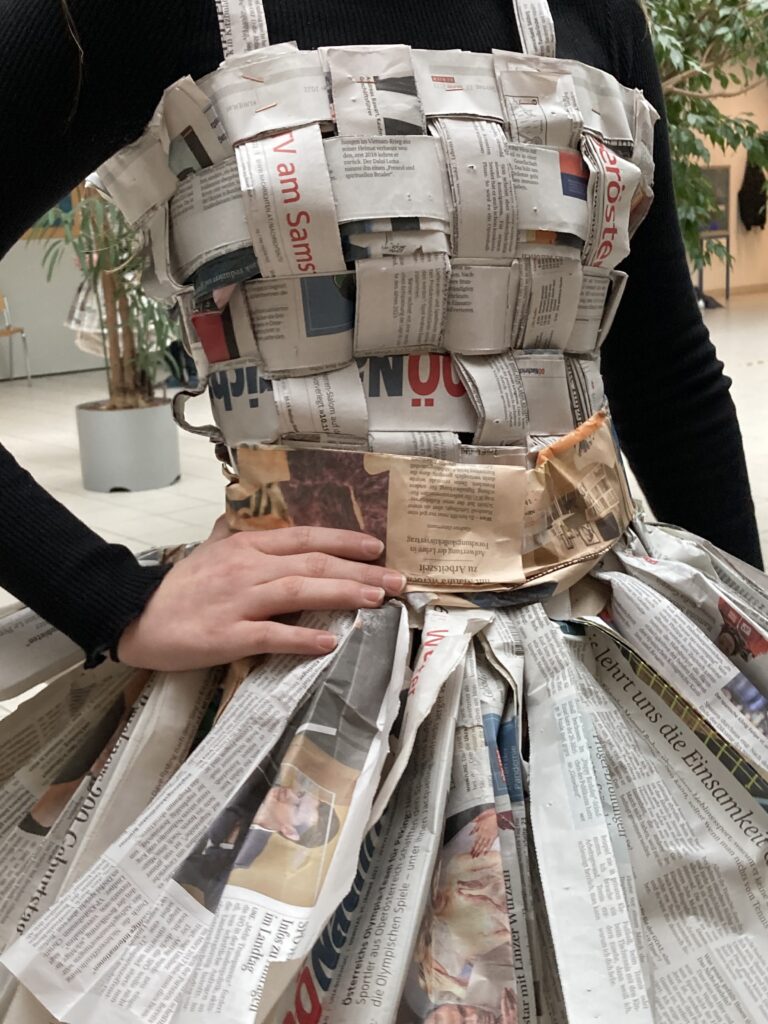 Die Schüler*innen der 4. Klassen, die den gymnasialen Zweig besuchen, stellten im Sprachenatelier ihre Kreativität unter Beweis und fertigten originelle Outfits aus Zeitungspapier an. So entstanden aus alten Zeitungen ein Schottenrock mit Stirnband, ein Faltenrock mit einer eleganten Handtasche und zwei hübsche Kleider mit kreativen Details. Dabei wurde gewebt, gefaltet, geklebt, geschnitten sowie Blumen und andere Accessoires gebastelt. Die Schüler*innen konnten ihrer Kreativität freien Lauf lassen und hatten viel Spaß beim Anfertigen und Anprobieren ihrer Kleidung. Anschließend durften sie ihre selbst designten Kleidungsstücke in einer „Modenschau“ vorführen. Die anderen Gruppenmitglieder präsentierten ihr Model auf Französisch und kommentierten die Kleidungsstücke. Die folgenden Fotos zeigen die originellen Kleidungsstücke der 4. Klassen.