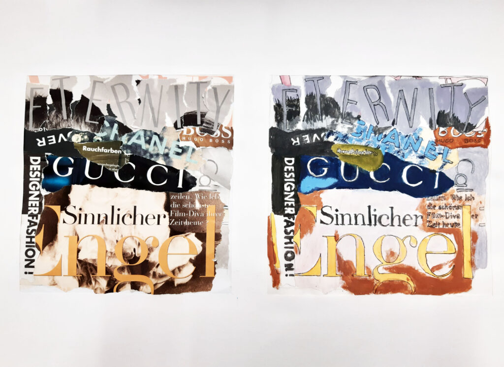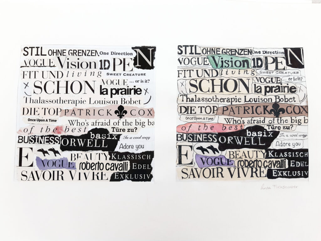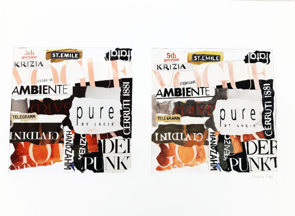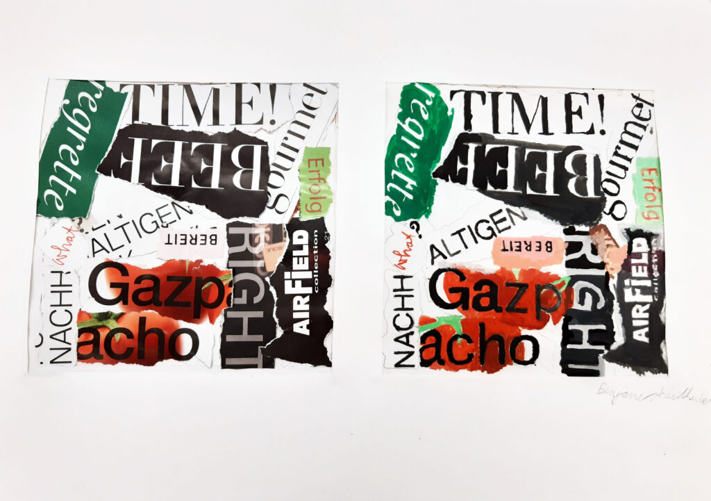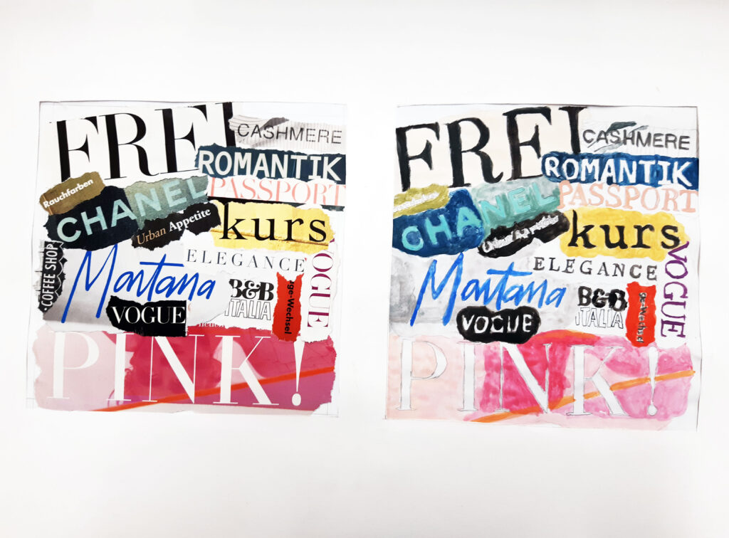In Form einer Collage wurden unterschiedliche Schriftstücke aus Zeitschriften herausgerissen und zu einem neuen Schriftbild arrangiert. Durch das praktische Tun vertieften die Schüler*innen ihr erlerntes Wissen über die ästhetische, künstlerische und funktionale Gestaltung von Buchstaben sowie deren Anwendungen in Druckwerken noch weiter.