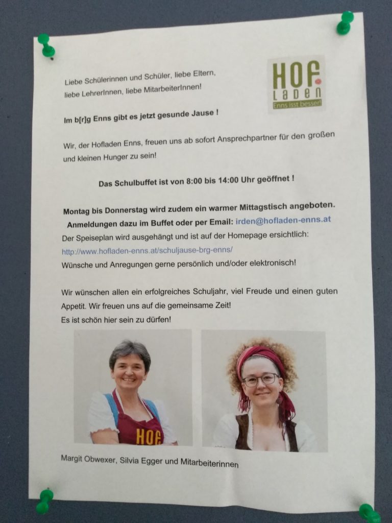 Der Hofladen Enns hat mit Schulbeginn das Schulbuffet unserer Schule übernommen. Seitdem finden wir dort viel Neues. Gesunde Jause, regional, saisonal und lecker wird GROSS geschrieben und ab ca. 11.00 Uhr durchströmen jeden Tag andere Düfte unser Schulgebäude und machen neugierig auf das Mittagessen. In diesen Genuss kommen alle TABE-Schüler*innen von Montag bis Donnerstag und natürlich auch alle anderen, die sich bis 11.00 Uhr zum Mittagessen anmelden. Der jeweilige Speiseplan wird ausgehängt oder ist auf der Homepage ersichtlich.