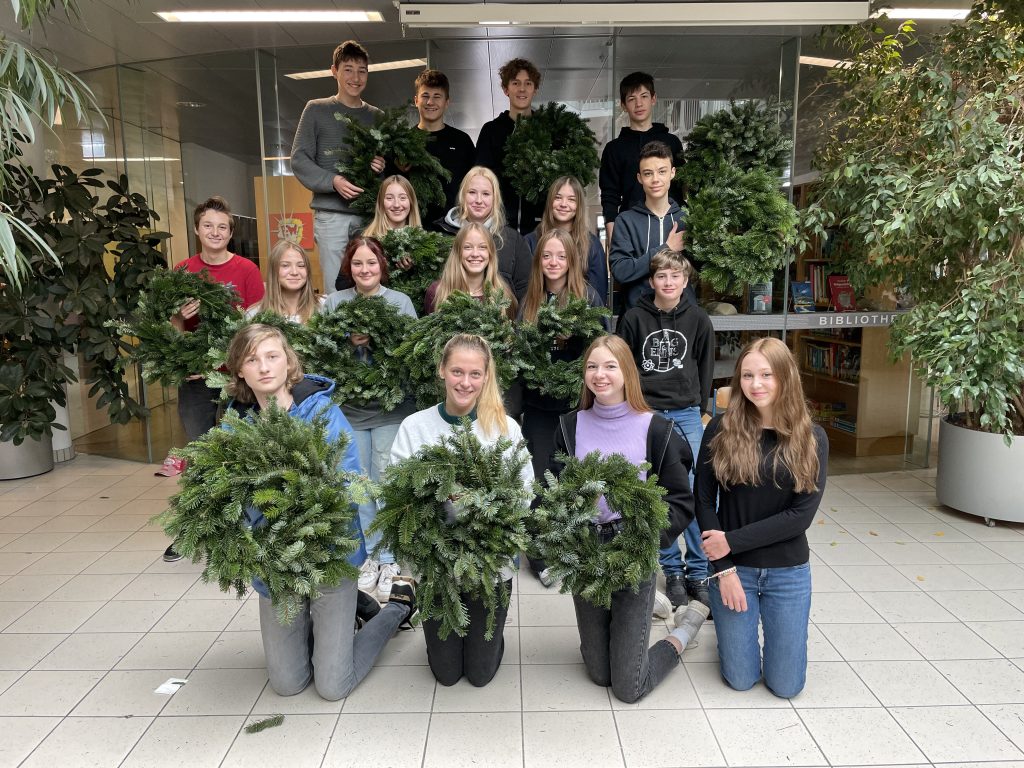 Wir halten unsere Kränze, die wir am 24.11.2022 gebunden haben, mit vollem Stolz in unseren Händen. Wieder einmal konnten die Schüler*innen beweisen, wie viel Geschick, Freude und Motivation beim Adventkranzbinden in ihnen steckt.
