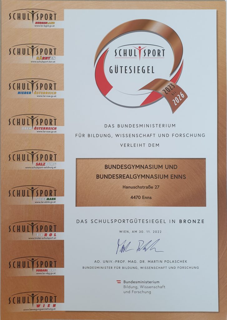 Mit der Verleihung des Schulsport-Gütesiegels in Bronze, am 24. Mai 2023 im Bischöflichen Gymnasium Petrinum in Linz, bewies das b[r]g Enns erneut, welche zentrale Rolle der Sport im Leben der Schule einnimmt. Ein großes Dankeschön an die verantwortlichen Sportlehrerinnen und Sportlehrer.