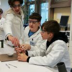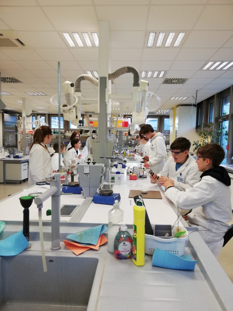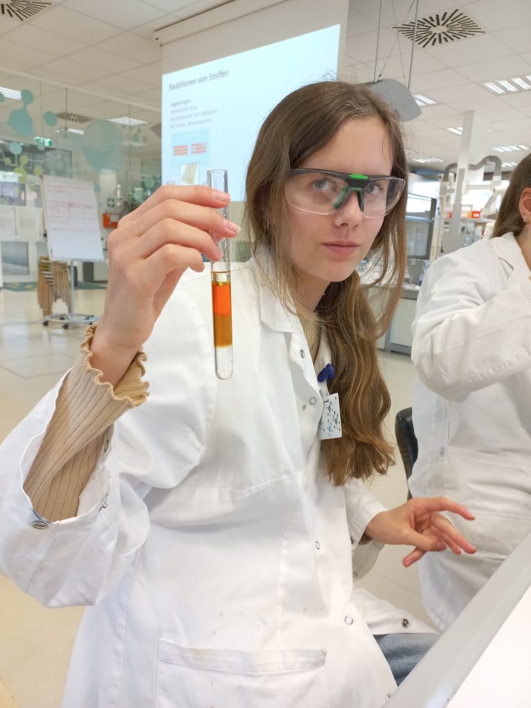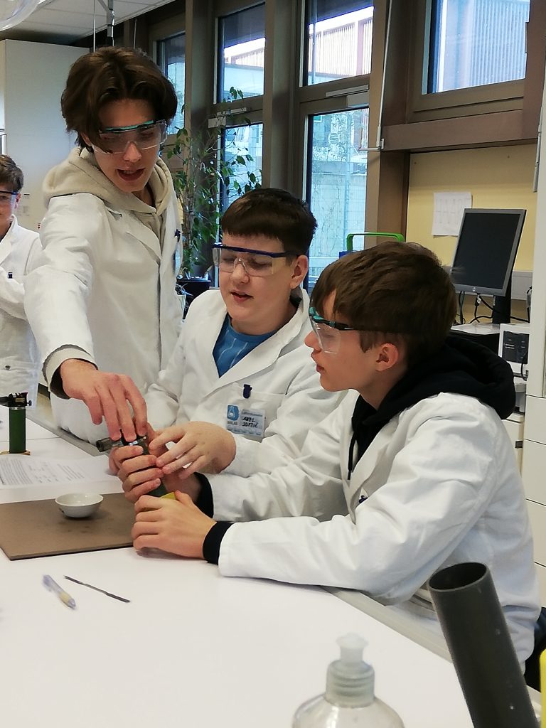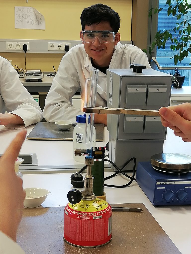 Zuletzt wurden die Schüler*innen der 4E selbst zu Goldfälschern: Kupfer, etwas Säure, Pinzetten, Ethanol, starke Lauge und Zink, wieder mal der Gasbrenner, schön heiß machen und ……………… pures Gold! Oder doch nicht?