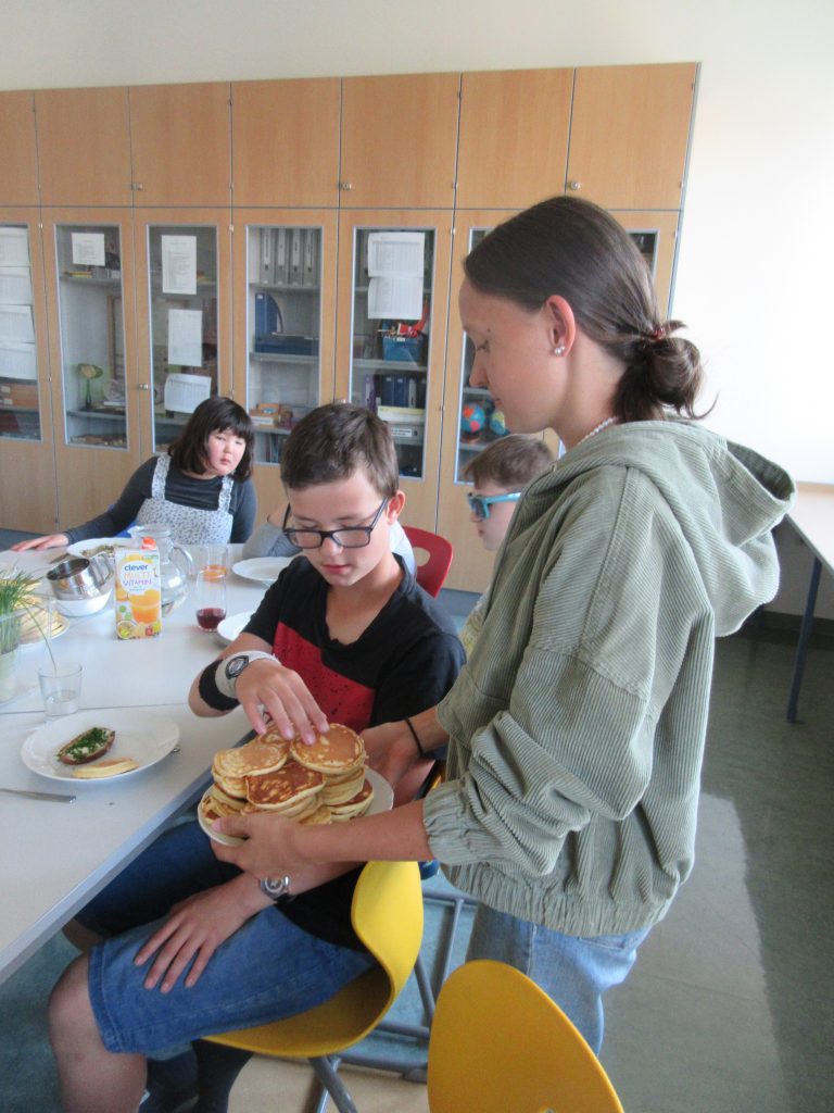 Zuerst wurden wir im Schulgebäude herumgeführt. Wir waren sehr beeindruckt von der Ausstattung, z.B. gab es in jedem Stock Hängematten und eine sehr gut ausgestattete Küche. Dort kochten wir mit den Schüler*innen dann auch Pancakes, wodurch wir sie besser kennenlernten. Nach einem Spaziergang war es dann auch schon wieder vorbei und wir freuen uns darauf, wenn die Kinder und Jugendlichen uns bald besuchen werden.