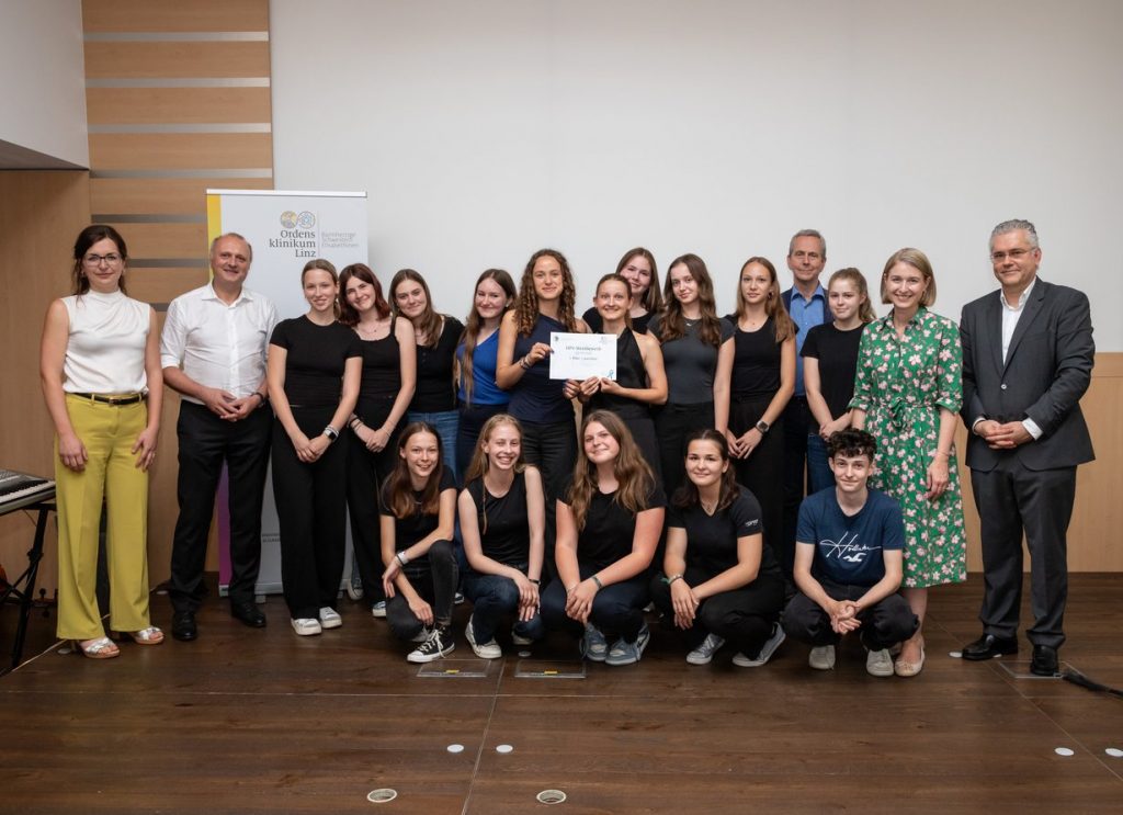 Foto anbei (©Ordensklinikum Linz): Die Schüler*innen der Klassen 6 A mit Mag. Sabrina Adelberger des Bundesgymnasiums und Bundesrealgymnasiums Enns mit Landeshauptmann-Stellvertreterin Mag.a Christine Haberlander, Prim. Univ.-Prof. Dr. Lukas Hefler, Vorstand der Abteilung Gynäkologie am Ordensklinikum Linz und Konventhospital der Barmherzigen Brüder, Dr. Stefan Meusburger, Geschäftsführer Ordensklinikum Linz und Mag. Hubert Eisl, Geschäftsführer Konventhospital Barmherzige Brüder Linz.