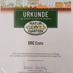 Wie wird man „Natur im Garten“-Schule? Dazu müssen zunächst verschiedene Kriterien erfüllt werden wie z.B. keine chemisch-synthetischen Pestizide oder Dünger und kein Torf verwenden, dann werden gestalterische Naturgartenelemente wie Beerenhecken, Wildblumenwiesen, Komposthaufen, heimische Bäume und Sträucher mit einbezogen. Darüber hinaus sollte ein wesentlicher Schwerpunkt auf Lern- und Bewegungsmöglichkeiten im Schulgarten gelegt werden, was teilweise durch den angrenzenden Kinderspielplatz, den wir wesentlich mitgestalten durften, gegeben ist. All diese Kriterien können wir an unserer Schule erfüllen, womit wir die Auszeichnung einer „Natur im Garten“-Schule am 22.10.2024 erhielten. Eine Plakette am Haupteingang, eine Urkunde sowie ein Gutschein für ein Gartenprojekt sind Zeichen dieser Auszeichnung.
