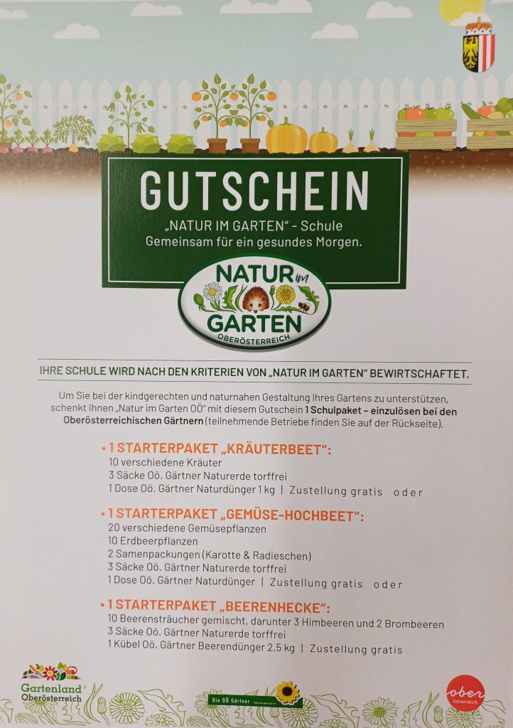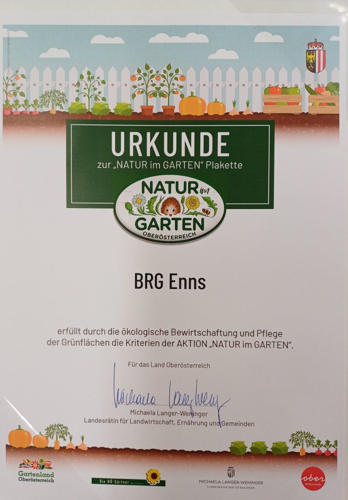 Wie wird man „Natur im Garten“-Schule? Dazu müssen zunächst verschiedene Kriterien erfüllt werden wie z.B. keine chemisch-synthetischen Pestizide oder Dünger und kein Torf verwenden, dann werden gestalterische Naturgartenelemente wie Beerenhecken, Wildblumenwiesen, Komposthaufen, heimische Bäume und Sträucher mit einbezogen. Darüber hinaus sollte ein wesentlicher Schwerpunkt auf Lern- und Bewegungsmöglichkeiten im Schulgarten gelegt werden, was teilweise durch den angrenzenden Kinderspielplatz, den wir wesentlich mitgestalten durften, gegeben ist. All diese Kriterien können wir an unserer Schule erfüllen, womit wir die Auszeichnung einer „Natur im Garten“-Schule am 22.10.2024 erhielten. Eine Plakette am Haupteingang, eine Urkunde sowie ein Gutschein für ein Gartenprojekt sind Zeichen dieser Auszeichnung.