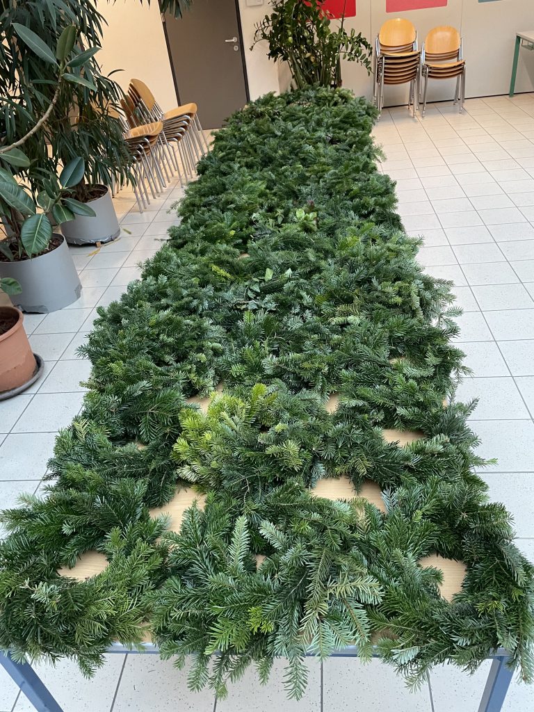 So wie im Film „Dinner for One“ das Essensritutal jedes Jahr wiederholt wird, wiederholen wir das Kranzbinden jedes Jahr und füllen das Schulhaus mit Tannenduft, fröhlichen Gesichtern, viel Kreativität und ganz viel Motivation. Viele kleine und große Künstler*innen zeigen, was sie können, auch, wenn sie noch nie einen Adventkranz gebunden haben. Beeindruckend, wie viel Fingerspitzengefühl, motorisches Können und Fantasie hier zum Vorschein kommen.