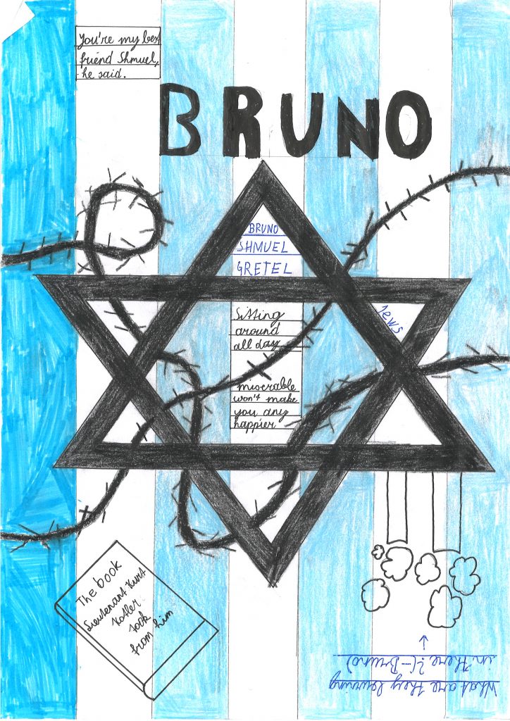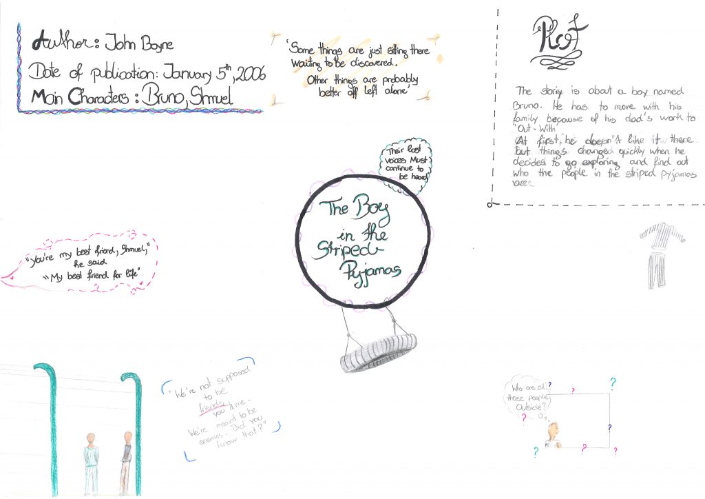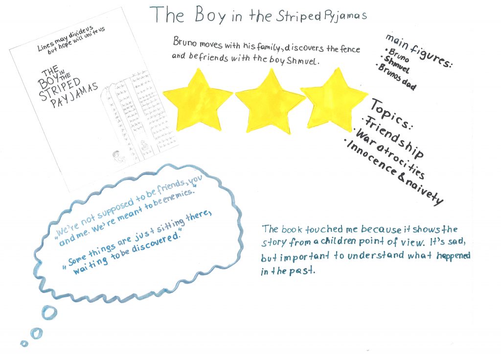 Each student took an A4 or A3 sized paper and designed a kind of summary about the historical fiction novel by John Boyne. It was up to the students how many sections, which topics and how much they want to write or draw. Creativity and self-organization is needed to complete such a task.