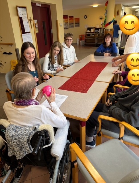 Im Vorfeld hatten wir uns im Ethikunterricht einige Aktivitäten überlegt, wie z.B. das Singen bekannter Lieder oder das Spielen gemeinsamer Spiele. Vor Ort passten wir unsere Ideen an die Wünsche der Bewohner*innen an. Besonders viel Freude bereitete den älteren Damen und Herren das gemeinsame Singen bekannter Lieder und das Spielen mit einem Ball, sei es ein Luftballon oder ein Gymnastikball. Schon das Rollen eines Balles über einen Tisch brachte die Gruppe zum Lachen.