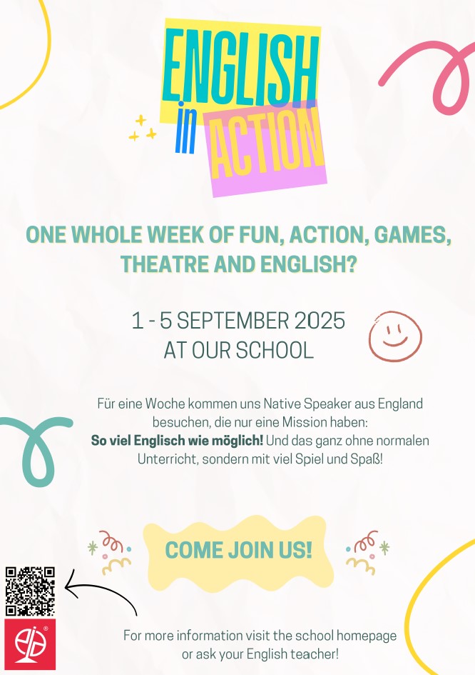 Alle Jahre wieder kommen uns am b[r]g Enns die Native Speaker aus England von English in Action besuchen. In der letzten Sommerferienwoche (01.09.-05.09.2025, jeweils 8:00-13:35 Uhr) haben Schüler*innen die Chance, in diesen Kursen ihr Englisch in Szene zu setzen, den alltäglichen Gebrauch der Sprache auf spielerische Art und Weise zu verbessern und für das neue Schuljahr aufzuwärmen. Dabei gibt es keinen Unterricht im klassischen Sinn, sondern ganz viel Spiel und Spaß.