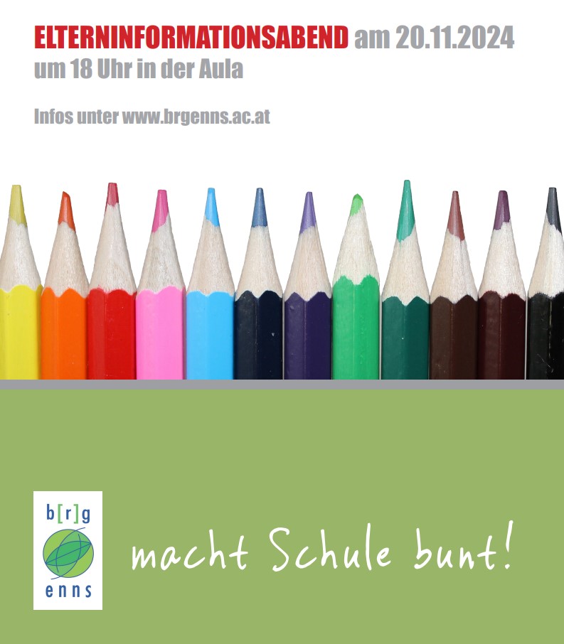 Am Abend des 20.11.2024 gibt es um 18:00 Uhr in der Aula des b[r]g Enns einen Elterninformationsabend, wo die Schule und deren Schwerpunkte (naturwissenschaftlich bzw. sprachlich-kreativ) vorgestellt werden. Ebenso stehen wir für individuelle Fragen zur Verfügung.