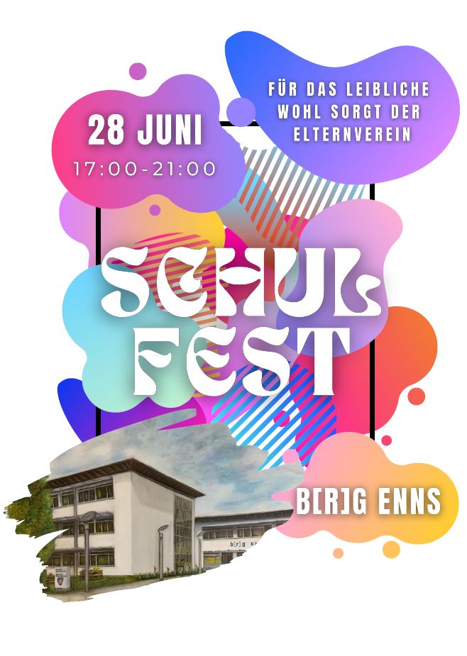 Das b[r]g Enns feiert am 28. Juni 2024 ab 17.00 Uhr sein traditionelles Schulfest. Der Elternverein der Schule ist um das leibliche Wohl aller Gäste bemüht und die Schülerinnen und Schüler bereiten gemeinsam mit ihren Lehrerinnen und Lehrern ein unterhaltsames Programm vor. Das Fest findet bei jedem Wetter statt.